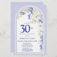 Elegant 30års födelsedag Party-inbjudan innehåller en Boho-blommigt som är gjord av vita daisy och blåa vilda blommor. Det här objektet är en del av Boho Arch Blue and White Blommigt Collection.