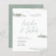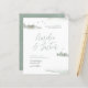 Budget Watercolor Mountains Destination Wedding bjudande. Med ett calligrafteckensnitt för chic för namn och serif-typografi för dina bröllop-detaljer, med vattenfärgsberg, kabin och träd med några känsliga penseldrag.