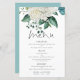 Budget White Blommigts Eucalyptus Bröllop Menu. Ett underbart värde storlekt på 5,5 x 8,5 tum i en rad pappra alternativ. En informell textformatering för huvudrubriken Menu som kompletterar resten av texten som du lätt kan anpassa, med vackra vita blommor och löv överst.