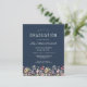 En vacker vattenfärgsblommigt gräns av vilda blommor dekorerar grund kant i det här trendiget boho studentfest inbjudan. Anpassa den vita texten på en marin blå bakgrund med student namn i handskriftsskript, skolåret och klassåret i sans serif samt datum, plats och OSA i serif-teckensnitt. Byt enkelt ut exempelbilden på baksidan mot ett lodrät av student.