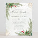 Vackert, prisvärt inbjudningskort för möhippan med handmålade botaniska vattenfärgillustrationer av vintergrön, gräs och grisen grenar, koner och hallon med guld glitter. Valet av perfekt för vinter eller jul helgdag kallat bröllop.
