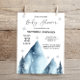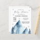Fånga vinterskönheten med den här fantastiska babyduschinbjudan. Med ett bildlandskap i bergstrakterna som är försett med känsligt snöflingor utstrålar den här designen värme och charm för ditt speciella evenemang. Den mjuka blåa och vita paletten färg väcker en fridfull, vintrig atmosfär, medan elegant typsnitt belyser händelsedetaljerna. Perfekten för en mysigt vinter firande anger inbjudan tonen för en minnesvärd babydusch omgiven av säsongens magi.