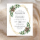 Den här utformningen har ett guld-geometriskt ram som är dekorerat med vattenfärgen gräs och vintern, inklusive eukalyptus och holly löv. Idealisk för en vinter eller jul, bröllop. Kortets baksida är en matchande skugga av solid grönt.