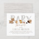 Skapa dina egna budgeterade trädjur Kön Neutral Baby Shower-inbjudningar med hjälp av dessa mallar från Eugene Design. Dessa moderna babyduschinbjudningar till skogarna, där ord "baby" skärs ut i ett trä struktur (bild) omgivet av skogsdjur från baby - ett hjort, en ekorre, ett räv, ett marsvin gris, en hedgehog och en bäver - är underbara för både pojke och flicka. Baksidan är en rustik grått-träbild med hand plockade rand.