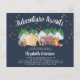 En budgetvänlig inbjudan till rustiska babyduschar med en söt illustration av trädsdjur som campar med tält i bergen och skogen, ett överlägg av guld-stjärnor i natt himlar och "Äventyr Awaits" och mor till namn i ett vitt skript.