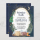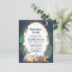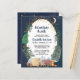 Budgetvänlig rustik baby sprinkle-inbjudan med en söt illustration av skogsdjur med tält-camping i bergen och skogen, ett överlägg av guld-stjärnor och måne i ett natt-himlar och "Äventyr Awaits" och mor-till-sida-namn i ett mörk midnattblått skript. Anpassa enkelt duschdetaljer om sprinkle i baby.