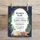 Det budgeterade parets inbjudan till babydusch med en söt illustration av skogsdjur med tält-camping i bergen och skogen, ett överlägg av guld-stjärnor och måne i ett natt-himlar och "Äventyr Awaits" och den blivande föräldern namn i ett mörk i midnattsblått skript. Anpassa enkelt duschdetaljer.
