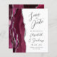 Det moderna bröllop spara datum-kortet på den lämnat kant i eleganten har en burgundröd vattenfärgsagat gräns som trimmas med faux silver glitter. Med anpassadet kombineras grått-handskrift, tryckplåt och kursivt typsnitt på vit bakgrund. Den bakomliggande sidan har en matchande burgundi och silver-agate-design.