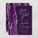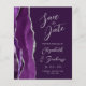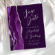 Det moderna bröllop spara datum-kortet från elegantens lämnat kant har en lila vattenfärgsagat gräns som trimmas med faux silver glitter. Med anpassadet kombineras handskrift av silver grått, tryckplåt och kursivt typsnitt på plommonbakgrund. Den omvända sidan har en matchande lila- och silver-agate-design.