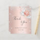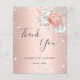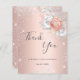 Ett tack för en 50-årsdag (eller vilken ålder som helst). En ro guld-faux-metall tittar bakgrund färg. Dekoreras med vita blommigtar och ro guld och faux glitter damm. På framsidan, ett skript med stora bokstäver och texten: Tack, text, titel och datum. Tillbaka: Anpassa och lägg till tackkort och namn.