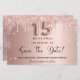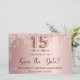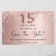 Ett giftigt och trendig Spara datumkortet för en Quinceañera, 15:e födelsedagsfesten. Metallisk bakgrund i ro-guld tittar med droppar och stoft från ro och faux-glitter. Anpassa och lägg till datum och namn/text. Texten: Spara datumet skrivs med ett stort trendig-handskript i stil med dekortecken. Nummer 15 med ett stil-teckensnitt med ballong.