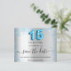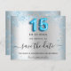 Ett giftigt och trendig Spara datumkortet för en Quinceañera, 15:e födelsedagsfesten. En faux silver tittar bakgrund som dekorerats med blått faux glitter stoft. Anpassa och lägg till datum och namn/ålder. Texten: Spara datumet skrivs med ett stort trendig-handskript i stil. Nummer 15 med ett stil-teckensnitt med ballong.