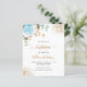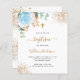 En vit bakgrund som dekoreras med eukalyptus greenery, en ljusblå ro och guldfärgade löv och faux guld glitter faller ned. Personalisera och barn namn och ceremoniuppgifter. Svart och guldfärgad färgad brev. Baksida: vit bakgrund med droppar av guldfaux glitter