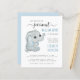 En budgetvänlig virtuell duschinbjudan till pojke. "Vår söta lilla jordnöt är på väg" är skriven i en blandning av blå och mjuk grått typografi och ett söt skript med dekorationer. Anpassa namn i pojke och mor till blå typografi bredvid en söt vattenfärg på en elefant från pojke och lägg till onlinens duschdetaljer i enkel modern grått-typografi.