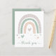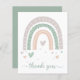 Ett budgetvänligt, boho-inspirerat, modernt tack för vilket tillfälle som helst med en abstrakt med en grönt, orange och lavender-regnbåge med hjärtan och "tack" skrivet i ett grönt under snyggten. På motsatt sida kan du anpassa ett tackmeddelande och lägga till ditt namnteckning, allt i vit text mot bakgrund av en grönt.