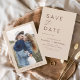 Budgetera Bröllop Boho Terracotta Spara datumkort som har ett foto på framsidan. Spara datumkorten innehåller en modern handskriven kursiv skripttypografi som är elegant, enkel och modern till använda efter att du har minimalistisk enkel bröllopsdag firande.