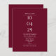 Ett modernt, minimalistiskt inbjudningsprogram för budgetbröllop som innehåller ditt speciella datum och bröllop-detaljer som finns i klassisk, chic-typografi på en burgundisk bakgrund. Designad av Thisisnotme©