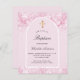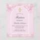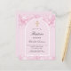 En rosa och en båge ram. Dekorerad med damm från rosa faux glitter. Personalisera och en namn och ceremonidetaljer. Elegant-handskript i stil. Tillbaka: rosa bakgrund.