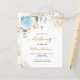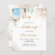 En vit bakgrund som dekoreras med eukalyptus greenery, en ljusblå ro och guldfärgade löv och faux guld glitter faller ned. Personalisera och barn namn och ceremoniuppgifter. Svart och guldfärgad färgad brev. Baksida: vit bakgrund med droppar av guldfaux glitter