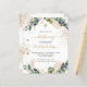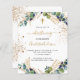 En vit bakgrund som dekoreras med eukalyptus grey och golden löv och faux guld glitter droppar. Personalisera och barn namn och ceremoniuppgifter. Svart och guldfärgad färgad brev. Baksida: vit bakgrund med droppar av guldfaux glitter