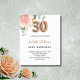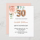 En inbjudan till elegant till 30års födelsedag party. En vit chic bakgrund. Dekorerad med en ro guld och en rosa vattenfärgad blomma, blommigt, grönt eucalyptus löv, spriter, grönsaks- och faux ro sprigs. Personalisera och närmare uppgifter om namn och party. Svarta och gyllene brev. Namn är skrivet med ett modernt handskript i stil. Nummer 30 är skrivet med ett gyllene stil-teckensnitt. Bakåt: ro guld, färg.