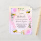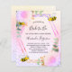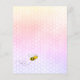 Elegant, roligt, sommaren inbjudningskort för möhippan. En bakgrund för regnbåge i rosa, lila och gyllene med en bikaka i mönster. Ett geometriskt ram. Dekorerad med blommor och eukalyptus greenery och lycklig humla. Med texten: Bride to Bee och namn i bruden på framsidan skriven med ett modernt handskript skrivet stil. Black brev. Rygg: honungskomb mönster och ett lycklig-leende bi.