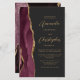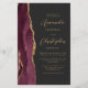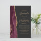 Den här elegantens lämnat kant har en modern bröllopsinbjudan med en burgundröd vattenfärgad agat gräns som trimmas med faux guld glitter. Anpassadet kombinerar skript av guld-färgad och sans serif typsnitt på en svart bakgrund. En matchande burgundagatdesign visas på baksidan av kortet.