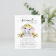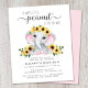 En rustisk och budgetvänlig duschinbjudan i flicka med texten "En söt liten jordnöt är på väg" skriven i en blandning av mjuk grått, modern typografi och snyggt, och en pastellfärgad rosa av en flicka-elefant som adorberats i solblommor. Anpassa mor namn och duscha detaljer i enkel grått typografi.