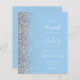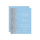 Den lämnat kant i eleganten är en modern bröllopsinbjudan från silver i glitter gräns. Med anpassadet text kombineras vit handskrift, tryckplåt och kursivt typsnitt på en pastellbakgrund baby blue. Lägg till ytterligare information på baksidan tillsammans med en QR-kod som hjälper dina gäster att besöka webbplatsen för bröllop.
