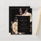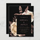 Den här eleganten innehåller den moody bröllopsinbjudan en lush, romantisk blommigt buquet i elfenben med ro guld faux foil och glitter löv på svart bakgrund. Anpassa rosan ro i typsnitt snyggt på en svart rektangel. Kortets baksida är starkt svart.