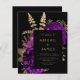 Den här eleganten innehåller den moody bröllopsinbjudan en lush, romantisk blommigt bouquet i lila med guld faux foil och glitter löv på svart bakgrund. Anpassa guld-färgad-texten i typsnitt snyggt på en svart rektangel. Kortets baksida är starkt svart.