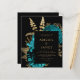 Den här eleganten innehåller den moody bröllopsinbjudan en lush, romantisk blommigt buquet i turkos med guld faux foil och glitter foliage på svart bakgrund. Anpassa guld-färgad-texten i typsnitt snyggt på en mörk-rektangel. Den omvända sidan är helsvart.
