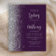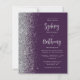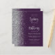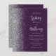 Den lämnat kant i eleganten är en modern bröllopsinbjudan från silver i glitter gräns. Anpassadet kombinerar kalligrafiskt skript av blek grått och sans serif-teckensnitt på en mörk lila-bakgrund. Den omvända sidan har en matchande lila- och silver-design.