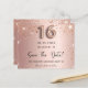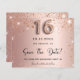 Ett giftigt och trendig Spara datumkortet för en svensk 16, 16:e födelsedagsfest. Metallisk bakgrund i ro-guld tittar dekorerad med damm från ro guld och faux glitter. Anpassa och lägg till datum och namn/text. Texten: Spara datumet skrivs med ett stort trendig-handskript i stil. Nummer 16 med ett stil-teckensnitt med ballong.