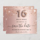 Ett giftigt och trendig Spara datumkortet för en svensk 16, 16:e födelsedagsfest. Metallisk bakgrund i ro-guld tittar dekorerad med damm från ro guld och faux glitter. Anpassa och lägg till datum och namn/text. Texten: Spara datumet skrivs med ett stort trendig-handskript i stil med dekortecken. Nummer 16 med ett stil-teckensnitt med ballong.