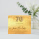 Ett giftigt och trendig Spara datumkortet för en 70:e födelsedagsfest. En modern faux-metallisk tittar i guld, dekorerad med faux glitter drops, färgdroppstift. Anpassa och lägg till ett datum och namn. Texten: Spara datumet skrivs med ett stort trendig-handskript i stil. Nummer 70 med ett stil-teckensnitt med ballong.