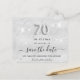 En elegant Spara datumkortet för en 70:e födelsedagsfest. En modern faux-metallisk tittar i silver som dekoreras med faux glitter stoft. Anpassa och lägg till datum och namn/ålder. Grått färgad brev. Texten: Spara datumet skrivs med ett stort trendig-handskript i stil. Nummer 70 med ett stil-teckensnitt med ballong.