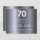 En elegant Spara datumkortet i 70 födelsedagsfester. En modern faux-metalliskt tittar bakgrund i silver. Anpassa och lägg till datum och namn/ålder. Texten: Spara datumet skrivs med ett stort trendig-handskript i stil. Nummer 70 med ett stil-teckensnitt med ballong.