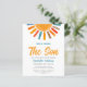 Inbjudan familj och vänner till din sol-temade babydusch med den här söta solskenspojkarnas budgetinbjudan. Texten "Här kommer sonen" i typografin snyggt med färgämnet sol. Enkelt anpassade. Ursprunglig vattenfärg © Michele Davies.