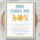 Inbjudan familj och vänner till din sol-temade babydusch med den budgetvänliga pojkens barnduschinbjudan. Texten "Här kommer sonen" i snyggtens retrotypografi med gult vattenfärgen sol. Enkelt anpassade. Ursprunglig vattenfärg © Michele Davies.