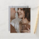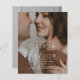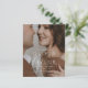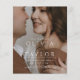 Utformningen har en sammanflätad, elegant anslutning av parets namn, som visas i ett stort serif-teckensnitt för ett tidslastigt och sofistikerat utseende. Bröllop-datumet skrivs vackert i skriptkalligrafi, vilket ger layouten en fin nyans. Inbjudans bakgrund visar ett foto av paret, skapar ett personligt och intimt intryck samtidigt som man blandar sig sömlöst med typografin och helestesiet.