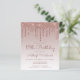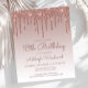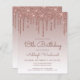 Trendigets 18:e födelsedagsinbjudan har en glatt bakgrund i ro guld faux glitter och gräns och bergrum. Ord "18:e födelsedagen" och hedersgästens namn visas i handskriftsskriptet mörk ro avslappnad, med resten av anpassadet i sans serif font. Samma droppdesign ro guld glitter visas på baksidan.