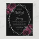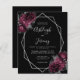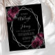 Den här elegantens moderna bröllopsinbjudan innehåller en silver-geometrisk ram som dekoreras med blommor från burgundi och silver på svart bakgrund. Anpassadet kombinerar silver grått med fysisk handskrift, tryckplåt och kursivt typsnitt. Den omvända sidan är helsvart.