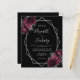 Den här elegantens moderna bröllopsinbjudan innehåller en silver-geometrisk ram som dekoreras med blommor från burgundi och silver på svart bakgrund. Anpassadet kombinerar silver grått med fysisk handskrift, tryckplåt och kursivt typsnitt. Den omvända sidan är helsvart.