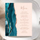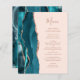 Den lämnat kant i eleganten i den moderna bröllopsinbjudan har en tårblått vattenfärgsagat gräns som trimmas med faux ro guld glitter. I anpassadet kombineras handskript för dammig ro och typsnitt på rosa. Den omvända sidan har en passande teal och ro guld agate-design.