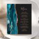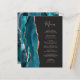 Den lämnat kant i eleganten i den moderna bröllopsinbjudan har en tårblått vattenfärgsagat gräns som trimmas med faux ro guld glitter. Anpassadet kombinerar handskriftsskript för ro rosa och typsnitt för kopieringsskylt på en baksida som inte är svart. Den omvända sidan har en passande teal och ro guld agate-design.