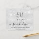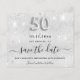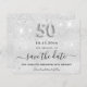En elegant Spara datumkortet för en 50:e födelsedagsfest. En modern faux-metallisk tittar i silver som dekoreras med faux glitter stoft. Anpassa och lägg till datum och namn/ålder. Grått färgad brev. Texten: Spara datumet skrivs med ett stort trendig-handskript i stil. Nummer 50 med ett stil-teckensnitt med ballong.