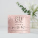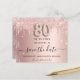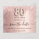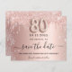 Ett giftigt och trendig Spara datumkortet för en 80:e födelsedagsfest. Ro guld övertoningsbakgrund som dekoreras med dropparna ro guld och silver glitter. Anpassa och lägg till datum och namn/text. Texten: Spara datumet skrivs med ett stort trendig-handskript i stil med dekortecken. Nummer 80 med ett stil-teckensnitt med ballong.