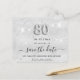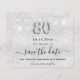 En elegant Spara datumkortet för en 80:e födelsedagsfest. En modern faux-metallisk tittar i silver som dekoreras med faux glitter stoft. Anpassa och lägg till datum och namn/ålder. Texten: Spara datumet skrivs med ett stort trendig-handskript i stil. Nummer 80 med ett stil-teckensnitt med ballong.
