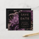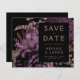 Den här eleganten har det moody bröllop spara datum-kortet en lush, romantisk blommigt bouquet i lila med faux foil i ro och glitter blad i svart bakgrund. Anpassa ro-färgad-texten i typsnitt snyggt på en svart rektangel. Lägg till ytterligare information på baksidan och ange URL:en för webbplatsen bröllop för att skapa en QR-kod.